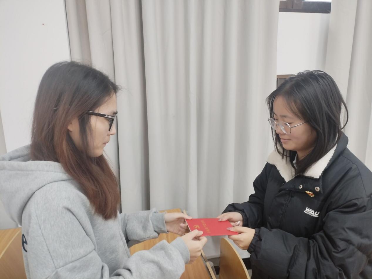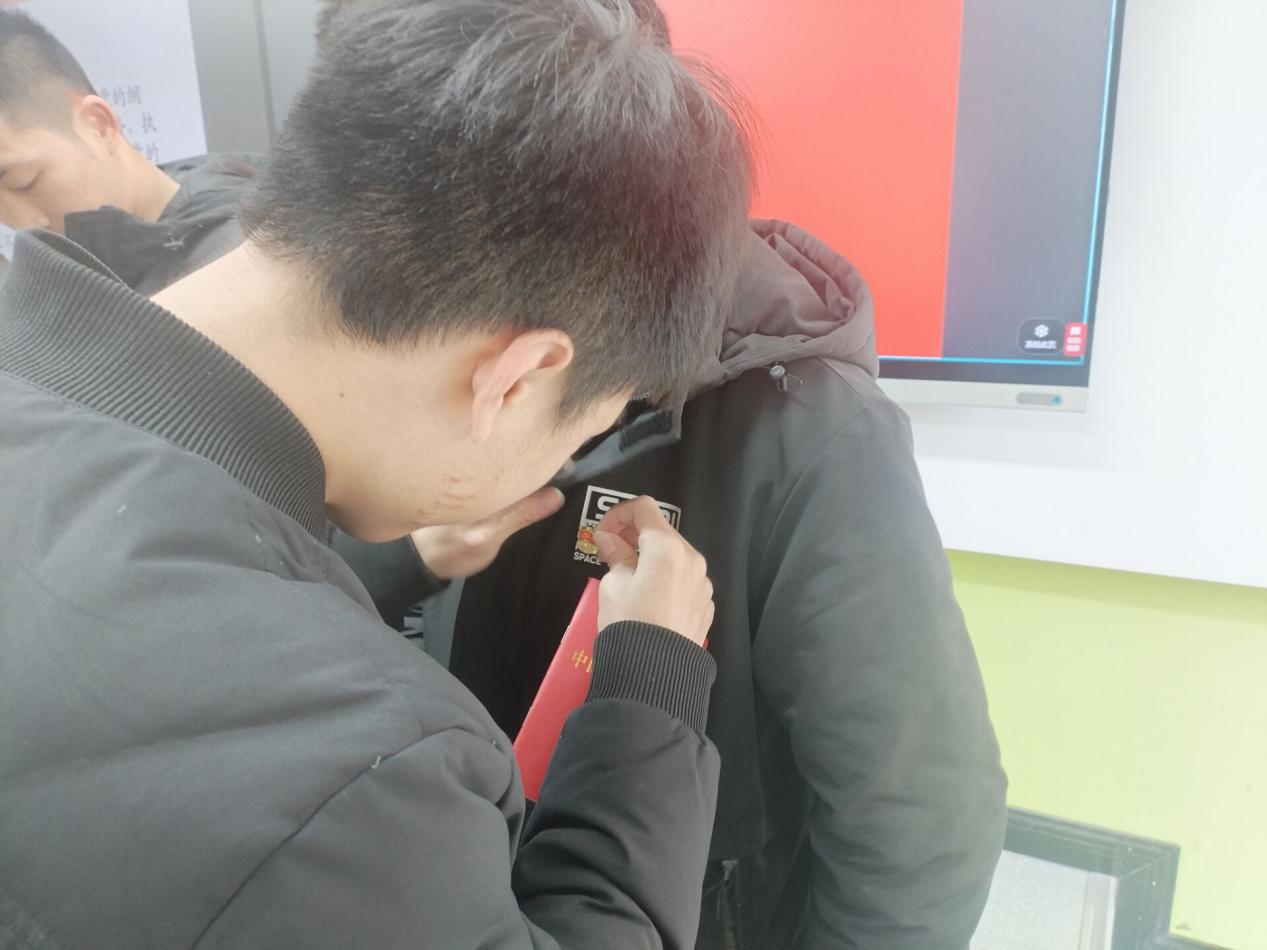 宣誓结束后,支部老党员们为8名新党员发放党章,并为她们佩戴党员徽章。