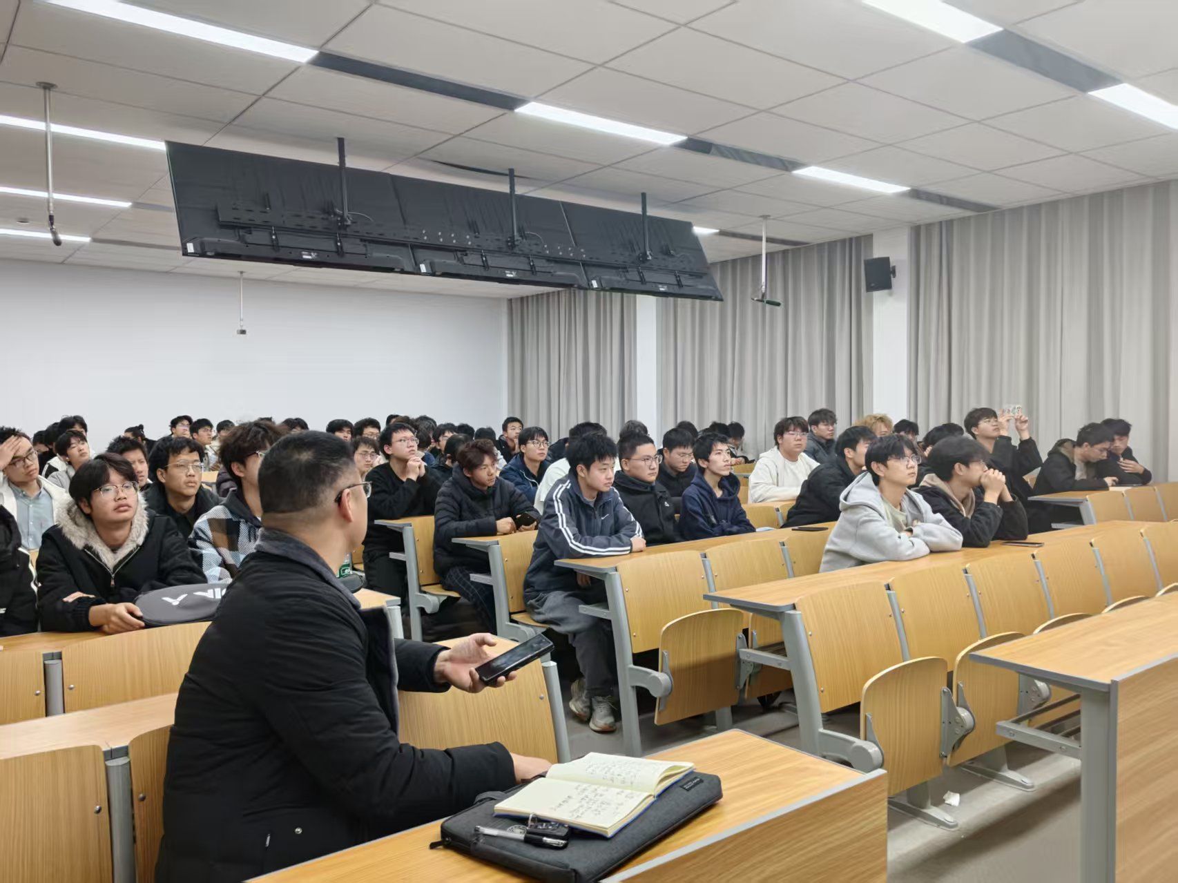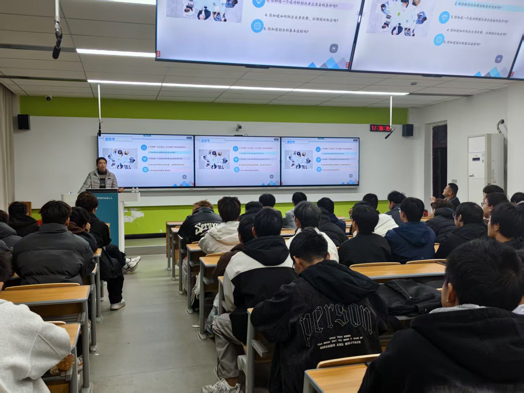 主题分享环节,辅导员吴勇围绕创新创业的全流程展开深度讲解。从灵感迸发的创意孵化,到优势互补的团队组建;从逻辑清晰的商业模式设计,到精准高效的市场推广,每一个关键节点都结合真实创业案例娓娓道来。鲜活的故事、实用的策略、独到的思维视角,让在场同学仿佛置身真实创业场景,不仅收获了可落地的实操方法,更对创新创业的本质有了立体而深刻的认知。